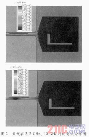仿真優(yōu)化設(shè)計(jì)使用HFSS11軟件,通過優(yōu)化,在設(shè)計(jì)過程中發(fā)現(xiàn)低頻段的輻射特性主要取決于共面波導(dǎo)上的DMS的設(shè)計(jì),見圖2所示,該圖為不同頻率下天線上的電流分布。文中天線的仿真分析集中在2.2 GHz、1O GHz一低一高的兩頻段。