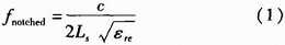同時(shí)為實(shí)現(xiàn)陷波特性而引入半波長(zhǎng)的諧振結(jié)構(gòu),在輻射貼片上開L形槽,其長(zhǎng)度約為需要抑制頻率對(duì)應(yīng)波長(zhǎng)的八分之一,使得天線在該點(diǎn)附近的阻抗失配,駐波比顯著增加。L形槽的關(guān)系可用式(1)表示