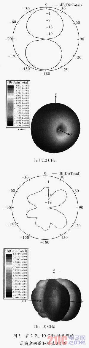 除了有較好的匹配外,帶DMS結(jié)構(gòu)和平滑斜角處理的UWB天線的輻射方向圖在諧振頻率上近似為全向橢圓,輻射方向圖相當(dāng)于全向天線。圖5為天線在2.2、10 GHz時(shí)的E面輻射方向圖和增益3D圖,從圖中可以看出天線在2.2 GHz時(shí),VSWR值約為1.08,其增益可達(dá)4.09 dB;而在10 GHz時(shí)天線的VSWR值約1.4,其增益可達(dá)6.13 dB。天線VSWR值較低時(shí),其天線增益也相對(duì)低一些;當(dāng)天線VSWR值稍高時(shí),其對(duì)應(yīng)增益也就相應(yīng)的高一些。