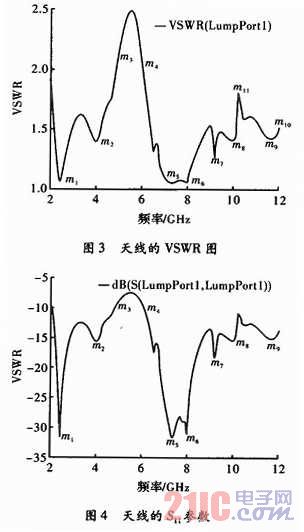 天線輻射貼片上的斜角約取17.3°,地板上的斜角約取18.7°。仿真驗(yàn)證了該處理能使天線在較寬的頻帶范圍里實(shí)現(xiàn)阻抗的匹配,且VSWR<2。另一方面是對(duì)地板上的微帶饋線采用有損微帶技術(shù)(DMS)可較好地拉低低頻段的頻率,DMS技術(shù)在以往的UWB天線設(shè)計(jì)里有不同的程度的應(yīng)用,像減小天線的矩形輻射貼片的尺寸,將其作為微帶天線的一種調(diào)諧技術(shù)。