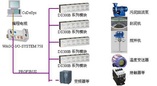 圖1 是整個系統(tǒng)的結(jié)構(gòu)圖,主站用的是萬可的PLC,具體型號為WAGO-I/O-SYSTEM 758,配置軟件用的是CoDeSys。從站設(shè)備用到的有通訊適配器CC-PB-1.0 4塊,16點的數(shù)字量輸入IO-DI16DC24 4塊,16點的數(shù)字量輸出IO-DO16DC24 5塊,8點輸入和8點輸出的數(shù)字量模塊 IO-DI8DO8DT05 2塊,8路模擬量輸入模塊" title="輸入模塊">輸入模塊IO-AI8OP16 6塊,6路熱電阻輸入模塊IO-RTD6OP16 10塊,以及一些變頻器和軟啟動器等來控制一些電磁閥、比例閥、接觸器" title="接觸器">接觸器、溫度變送器、PH值變送器等,執(zhí)行機(jī)構(gòu)為污泥回流泵、刮泥機(jī)、攪拌機(jī)等。