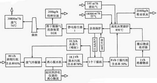 圖2 是一個典型的污泥焚燒工藝流程圖,流向離心脫水機(jī)的污泥是由約65%的消化污泥和35%的剩余污泥所組成的,經(jīng)機(jī)械脫水后,污泥含水率降至75%。干燥機(jī)" title="干燥機(jī)">干燥機(jī)形式為圓盤干燥機(jī)(飽和蒸汽壓為9bar),污泥經(jīng)過干燥處理后,可達(dá)到50%~55%的含固率,這種組分的污泥在流化床爐中可保證自行燃燒,無需額外添加助燃劑,可大大減少能源的浪費(fèi)。煙氣和飛灰在850℃左右時在同一個方向上離開焚燒爐,在余熱鍋爐中其溫度降至210℃,在接下來的靜電除塵器Ⅰ中進(jìn)行脫塵,剩余的灰塵含量約為100mg m。經(jīng)過準(zhǔn)干燥煙氣洗滌裝置凈化后的煙氣通過煙囪排放,灰塵被貯存在灰塵貯房中,稍后再利用或者運(yùn)走。