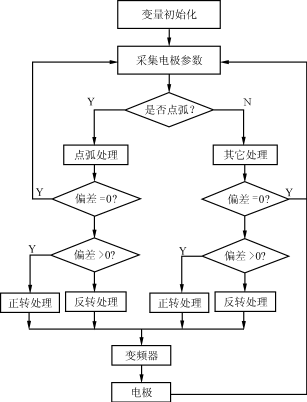 為了易于控制與維護(hù),電極的每一相都為一套獨立設(shè)備(包括傳感器,變頻器,電機和印刷線路板),為此在控制軟件的設(shè)計中采用分相進(jìn)行獨立控制的原則。此外,額定電流的設(shè)定和電源模塊的供電所需要的0~12V電源,可通過小型變壓器和WY17812,WY27912等組成的電路來實現(xiàn),此處不一一詳述。