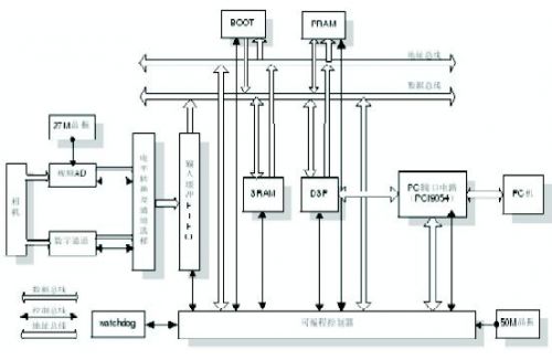 本系統(tǒng)的硬件邏輯控制電路是采用大容量的FPGA來實現(xiàn)的,采用的芯片是Xilinx公司的XCV50E。該芯片集成了約58000系統(tǒng)門,有16×24個 CLB Array,1700余個邏輯單元,可用I/O口 180個。在本系統(tǒng)中FPGA 控制了絕大部分單元,包括:通道選擇/電平轉(zhuǎn)換芯片、輸入輸出FIFO、SRAM、DSP、PCI接口電路等。利用FPGA芯片的系統(tǒng)內(nèi)可編程(ISP)性能,完成所有DSP外圍芯片的控制邏輯,并在其中設(shè)置狀態(tài)寄存器、命令字寄存器和專用寄存器,完成與主機的實時通信,接收主機傳送的命令信息和向主機傳送所需要的狀態(tài)信息?!?/p>