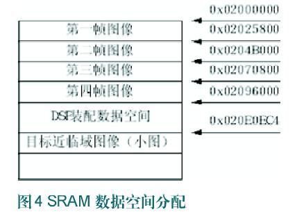 紅外動目標識別與跟蹤系統(tǒng)要完成對運動目標的識別與跟蹤。其實現(xiàn)算法必然涉及到對多幀(差分處理,至少兩幀)視頻圖像的處理。為了給實現(xiàn)算法提供較為充裕的存儲空間,我們選用的存儲器能容納6場視頻圖像。因此,最后選用的存儲器是Giga Semiconductor公司的兩片GS74116,每片容量為256K×16bit。考慮到我們的視頻圖像每場的數(shù)據(jù)量為76800像素,兩片512K的SRAM可以存下至少6場視頻圖像。在本系統(tǒng)中,我們設(shè)置了4幀圖象存儲空間,其余空間用于存放目標小圖、DSP裝配數(shù)據(jù)等,數(shù)據(jù)空間具體地址分配如圖4。