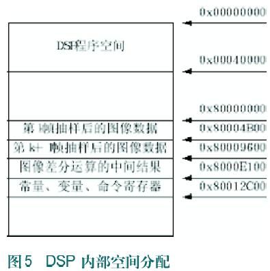 DSP在進行圖像的差分運算時,并沒有載入完整的各幀圖像,因為數(shù)據(jù)空間有限,若用完整的圖像幀進行差分,則由76.8K×3230KByte,加上其它常、變量、寄存器等,至少需要256KByte或以上的數(shù)據(jù)空間。大大超過芯片設(shè)定的數(shù)據(jù)空間。因此,我們采用隔點、隔行的亞抽樣。抽樣后,每幀圖像大小約為20KByte,總計約需80 KByte數(shù)據(jù)空間,C6202的片內(nèi)數(shù)據(jù)空間足夠所需。我們對DSP芯片的內(nèi)部空間分配如圖5。