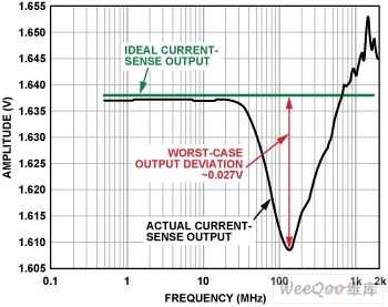 圖3. 電流傳感器輸出(內(nèi)置EMI濾波器,前向功率 = 12 dBm, 5 mV/分頻,>100 MHz時(shí)直流輸出達(dá)到峰值)