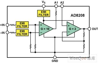 AD8208的更多詳情:AD8203(圖A)是一款單電源差動(dòng)放大器,非常適合在大共模電壓情況下放大和低通濾波小差分電壓。采用+5 V單電源供電時(shí),輸入共模電壓范圍為-2 V至+45 V。該款放大器提供增強(qiáng)的輸入過壓和ESD保護(hù),并內(nèi)置EMI濾波功能。