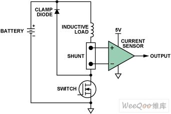 本例將詳細(xì)介紹一種典型的高端電流檢測(cè)應(yīng)用。圖1所示為汽車應(yīng)用環(huán)境中用于監(jiān)控電磁閥或其它感性負(fù)載的常見配置。