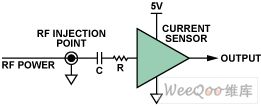 具體而言,這些測(cè)試都采用 “直接功率注入法”完成,這是一種通過電容將RF信號(hào)耦合至特定器件引腳的方法。根據(jù)待測(cè)IC的類型,針對(duì)不同的RF信號(hào)功率水平和頻率范圍,測(cè)試器件的每路輸入。圖4顯示了在特定引腳上執(zhí)行直接功率注入測(cè)試的原理示意圖。