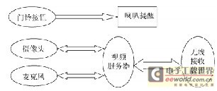 設(shè)計思路:監(jiān)控現(xiàn)場是由一個普通門鈴、攝像機、麥克風(fēng)和視頻服務(wù)器組成的。普通門鈴的作用是提示戶主,進行監(jiān)控。視頻服務(wù)器是整個監(jiān)控現(xiàn)場的關(guān)鍵,它主要是負責(zé)講攝像機和麥克風(fēng)采集到的模擬信號進行編碼壓縮、網(wǎng)絡(luò)傳輸,并且負責(zé)客戶服務(wù)端對攝像機和麥克風(fēng)的控制。其結(jié)構(gòu)圖如圖2所示: