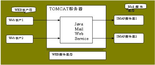 ??? Java Mail Web Service的設(shè)計結(jié)構(gòu),取決于電子商務(wù)如何實現(xiàn)。這里,兩者采用的都是一個經(jīng)典的MVC。即:Java Bean 做邏輯,JSP做顯示層,Servlet做Controller,同樣,還是用BEAN封裝了用戶的信息,由于JSP的容器使用了Apache的Tomcat,這個電郵服務(wù)器可看作一個3層結(jié)構(gòu),如圖:?