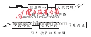 每個子系統(tǒng)由信息發(fā)射和信息接收兩部分組成,發(fā)射機(jī)原理如圖1所示,接收機(jī)原理如圖2所示。顧客呼叫服務(wù)系統(tǒng)的編碼和解碼是通過編碼、解碼芯片實現(xiàn)的,餐桌管理系統(tǒng)的編碼和解碼是通過單片機(jī)實現(xiàn)的。顧客呼叫服務(wù)系統(tǒng)的信息處理是通過聲、光顯示呼叫信息來實現(xiàn)的,餐桌管理系統(tǒng)能夠?qū)崟r顯示每臺餐桌空閑或占用時間。