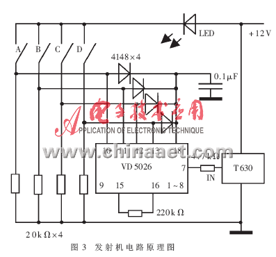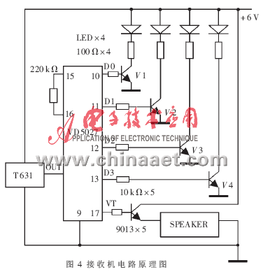 發(fā)射機(jī)電路原理如圖3所示,接收機(jī)原理如圖4所示。發(fā)射機(jī)采用VD5026編碼器作脈沖數(shù)碼調(diào)制。它具有8位4態(tài)地址編碼,并有4位數(shù)據(jù)輸入。發(fā)射機(jī)按鍵A、B、C、D,分別對應(yīng)接收機(jī)上解碼器VD5027的D0、D1、D2、D3數(shù)據(jù)輸出端,A、B、C、D分別代表4張餐桌上的按鍵。當(dāng)按下A鍵時T631接收頭收到編碼信號后,經(jīng)內(nèi)部解調(diào)放大整形后由OUT端輸出,經(jīng)VD5027解碼處理。當(dāng)編碼指令信息與VD5027所設(shè)定的數(shù)據(jù)一致時,解碼有效端VT與對應(yīng)的數(shù)據(jù)輸出端D0均輸出高電平,三極管V1導(dǎo)通,燈亮,VT驅(qū)動音樂模塊報警,其中D0鎖存保持高電平,VT是脈沖電平(要選擇觸發(fā)式音樂模塊)。