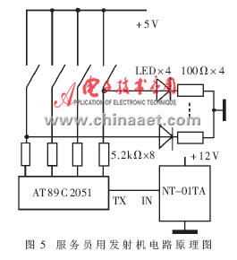 上述T630和T631的工作頻率是265MHz。為防止干擾,餐桌管理系統(tǒng)選擇了另外一種收發(fā)模塊,發(fā)射模塊型號為NT-01TA,接收模塊型號為NT-R01F,工作頻率為315MHz,這樣就避免了兩個系統(tǒng)相互干擾,同時這種模塊更適合與單片機(jī)連接。