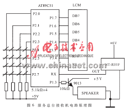 編碼芯片有4位數(shù)據(jù)位,同樣的編碼即使采用4-16譯碼器,最多也只能有16種編碼。用這種方法傳輸餐桌管理信息最多也只能處理16張餐桌信息,無法滿足實際需求,因此不能采用編碼、解碼芯片,而采用軟件編解碼方案。發(fā)射機(jī)編碼采用AT89C2051單片機(jī),接收機(jī)解碼采用AT89C51單片機(jī),這樣編碼和解碼就不會有任何限制,可以根據(jù)需要確定編碼位數(shù),而且也不象編碼、解碼芯片那樣只有地址編碼一致時才能接收數(shù)據(jù)碼。為與顧客呼叫系統(tǒng)一致,本系統(tǒng)也采用4位數(shù)據(jù)編碼,服務(wù)員編碼根據(jù)需要采用了8位編碼,這樣本系統(tǒng)最多可以處理1024張餐桌信息。