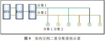 3G(WCDMA)室內(nèi)空間二重分集接收的實測數(shù)據(jù)速率,也可說明多天線作用。室內(nèi)分布空間二重分集接收如圖4所示。