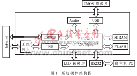 本電話終端系統(tǒng)的硬件方案為:使用三星公司的通用ARM芯片S3C2410配合嵌入式操作系統(tǒng)WINCE5.0.NET實現(xiàn)各種外圍接口,視音頻編解碼處理和傳輸控制協(xié)議等。這樣既不存在芯片成本高的問題,又能保持很高的性能,可通過簡單的程序下載實現(xiàn)軟件升級或增加新的編解碼標準。系統(tǒng)的硬件結(jié)構框圖如圖1所示。實現(xiàn)該系統(tǒng)的要點是:在WINCE下添加USB攝像頭和USB無線網(wǎng)卡驅(qū)動模塊。