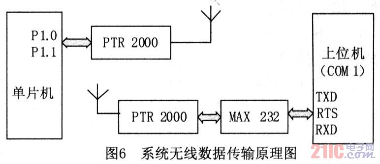 為了使設(shè)計的數(shù)據(jù)采集儀應(yīng)用方便,系統(tǒng)利用PTR2000無線數(shù)據(jù)傳輸模塊與上位機進行通訊,以便能隨時響應(yīng)控制中心的PC機的數(shù)據(jù)上傳命令,將采集到的數(shù)據(jù)實時上傳給控制中心。PTR2000是一種超小型、低功耗、高速率的無線收發(fā)數(shù)據(jù)傳輸模塊。其通訊速率最高可達20Mbit/s,也可工作在其他速率,如4800bit/s、9600bit/s。系統(tǒng)無線數(shù)據(jù)傳輸原理圖如圖6所示。