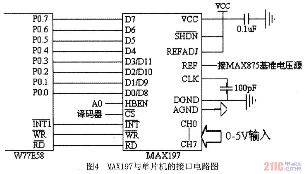 MAX197與單片機的典型接口電路如圖4所示。設(shè)計采用MAX197的CH0-CH6通道采集7路0-5V電壓信號。而4-20mA電流信號則經(jīng)過8選 1模擬開關(guān)CD4051輪流選通,再經(jīng)靈敏電阻,放大器轉(zhuǎn)化為0-5V電壓信號后,進入MAX197的CH7通道進行模數(shù)轉(zhuǎn)換,從而系統(tǒng)可以采集8路電流信號。
