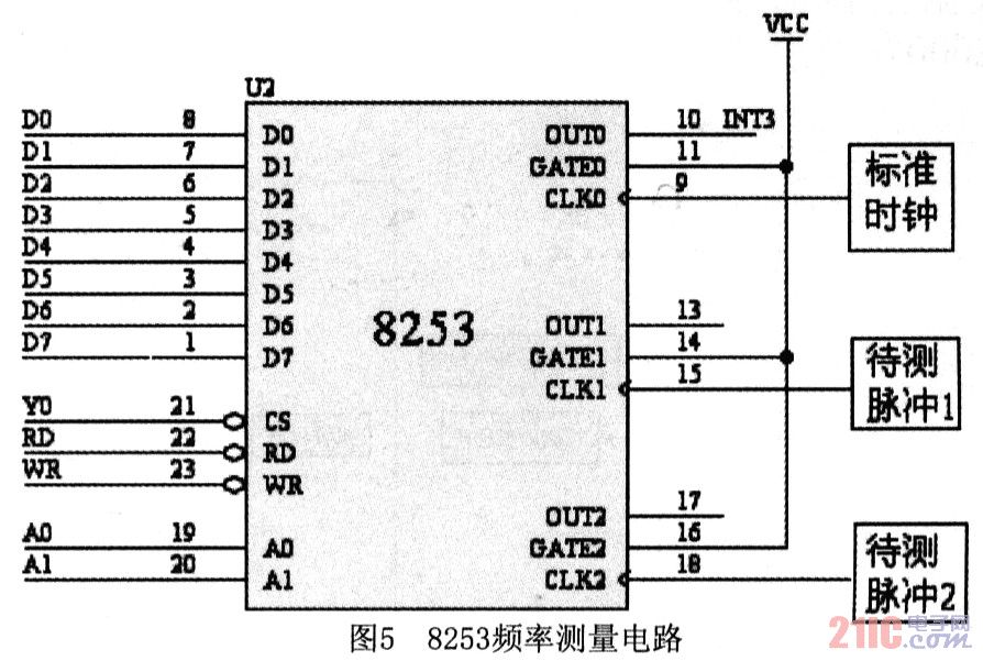 頻率信號測量電路如圖5所示。其中D0-D7與W77E58數(shù)據(jù)總線相連,單片機P2口高三位經(jīng)138譯碼器譯出的Y0與8253的CS引腳相連,用來選通8253芯片,8253的A0、A1直接與低二位地址線相連,因此8253的端口地址為1FFCH~1FFFH。