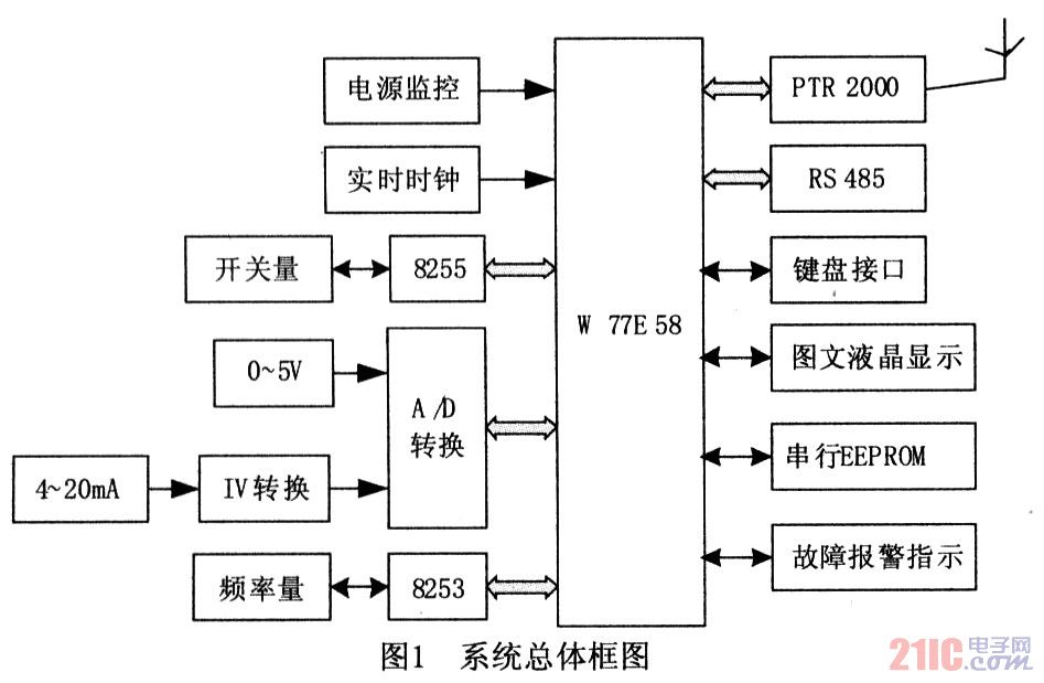 本文設(shè)計的通用數(shù)據(jù)采集和通訊儀能夠?qū)Ω鞣N現(xiàn)場設(shè)備的標準輸出信號進行采集,包括傳感器輸出的0-5V/4-20mA模擬信號;開關(guān)量信號;頻率量信號;此外系統(tǒng)還具有RS-485接口,以便能夠與現(xiàn)場具有485接口的智能儀表相連接。為了實現(xiàn)良好的人機交互,系統(tǒng)擴展了鍵盤輸入,液晶顯示,實時時鐘以及現(xiàn)場故障報警指示電路等模塊。系統(tǒng)總體框圖如圖1所示。