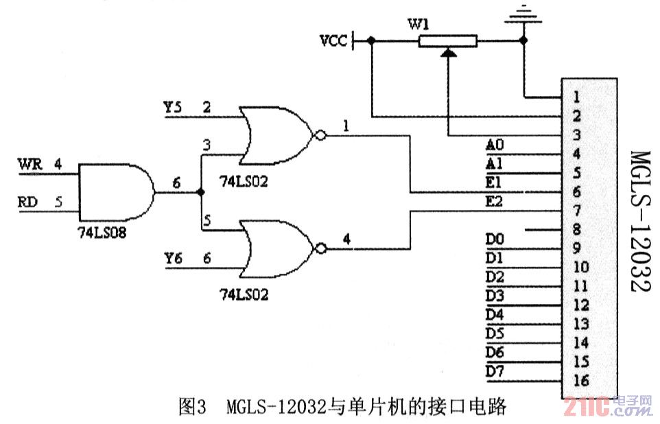 其中D0~D7與單片機的數(shù)據(jù)總線相連,A0、A1為單片機的P0口經(jīng)74LS373地址鎖存器后產(chǎn)生的低兩位地址線,系統(tǒng)用74LS138譯碼器產(chǎn)生的Y5、Y6作為MGLS12032兩個控制驅(qū)動器工作的選通信號。