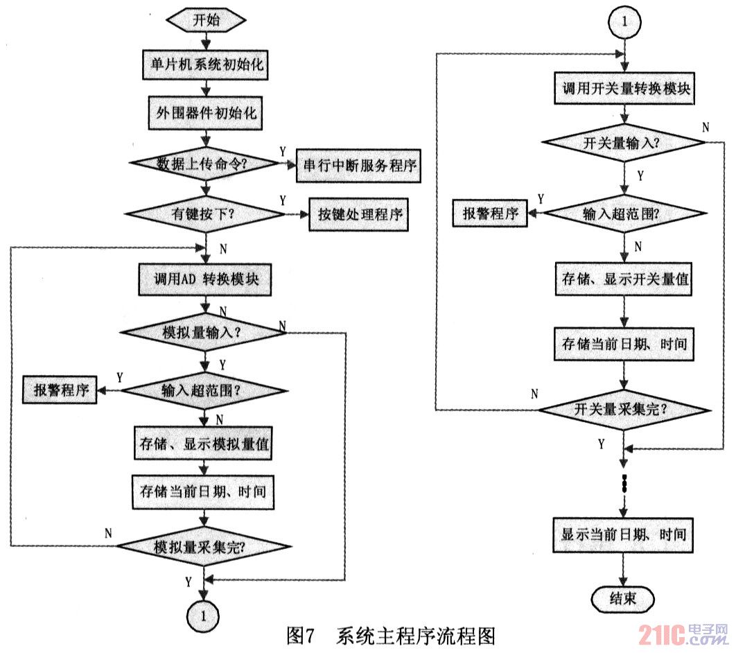 系統(tǒng)軟件采用模塊化設(shè)計,主程序首先對各接口芯片進行初始化,然后分別調(diào)用各個子程序模塊以進入各個數(shù)據(jù)采集子系統(tǒng),并將采集到的數(shù)據(jù)存儲在32K字節(jié)的串行E2PROM AT24C256中,以備控制中心查詢,同時將對應(yīng)的數(shù)據(jù)在液晶顯示器上顯示。如果系統(tǒng)接收到上位機的數(shù)據(jù)上傳命令,就將存儲在E2PROM中的數(shù)據(jù)通過 PTR2000發(fā)送給PC機。系統(tǒng)主程序流程如圖7所示。