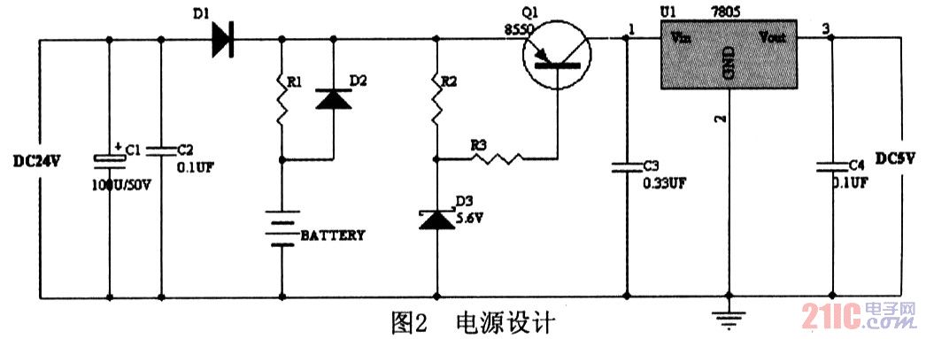 二極管D1起隔離作用,使得當電網(wǎng)偶爾停電時,能夠阻止電池電流流向24V穩(wěn)壓電源。穩(wěn)壓管D3(5.6V)的作用,是防止電池(+9V)過放電,即當電池放電下降到約6V時,因D3作用,三極管Q1截止,電池放電停止,此時單片機將停電。