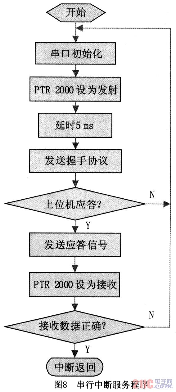 串口通信程序中雙方通信協(xié)議是至關(guān)重要的,這關(guān)系到無線數(shù)據(jù)傳輸?shù)目煽啃?,本系統(tǒng)約定雙方的通信協(xié)議格式如下:串行通信使用單片機的內(nèi)部定時器/計數(shù)器1 作為波特率發(fā)生器,本系統(tǒng)波特率設(shè)定為4800 bit/s;幀格式為1位起始位,8位數(shù)據(jù)位,1位停止位,無奇偶校驗;通信采用中斷方式;上位機采用COM 1通信。當接收到上位機的命令后,中斷服務(wù)程序?qū)?shù)據(jù)從單片機數(shù)據(jù)緩沖區(qū)取出,同時將模塊的接收狀態(tài)切換為發(fā)射狀態(tài),轉(zhuǎn)換過程所需時間約5ms,然后將這些數(shù)據(jù)以FSK的調(diào)制形式發(fā)射出去, PTR2000模塊隨后恢復(fù)為接收狀態(tài)。如果數(shù)據(jù)在傳輸?shù)倪^程中有數(shù)據(jù)丟失,上位機將要求單片機系統(tǒng)重新發(fā)送數(shù)據(jù),直到數(shù)據(jù)全部正確為止,串行中斷服務(wù)程序如圖8所示。