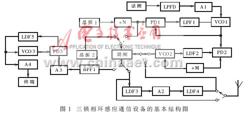 本文以鎖相環(huán)為主體構(gòu)成感應(yīng)式通信設(shè)備,該系統(tǒng)的調(diào)制、倍頻和解調(diào)均采用鎖相環(huán)。其工作原理如圖1所示。話音信號經(jīng)濾波處理和音頻放大,控制壓控振蕩器VCO1控制端,經(jīng)鑒相器PD1、低通濾波器LPF1所組成的鎖相環(huán)完成鎖相調(diào)頻。調(diào)頻信號由VCO1輸出,送入PD2與VCO2輸出信號進行相位比較,由PD2、LPF2、VCO2和M分頻電路組成鎖相環(huán)完成已調(diào)頻信號的M倍頻,使調(diào)頻信號的偏頻加倍。倍頻后的信號與晶振2信號混頻,輸出差頻信號經(jīng)LPF3濾波、A2放大、LPF4選頻,送入天線發(fā)射。發(fā)射信號為寬帶調(diào)頻信號,有較高的處理增益,從而提高了系統(tǒng)的抗噪性能。系統(tǒng)接收時,信號經(jīng)天線進入LPF3選頻、經(jīng)A2放大、再經(jīng)LPF4與晶振1分頻后的信號混頻,混頻后信號經(jīng)BPF1選出差頻、再經(jīng)A3放大進入PD3與VCD3輸出信號進行相位比較;PD3、LPF5、VCO3組成的鎖相環(huán)完成鑒頻;解調(diào)后信號經(jīng)A4放大送至終端(揚聲器),完成接收過程。由于采用鎖相鑒頻,可使系統(tǒng)的噪聲門限下調(diào)5dB~10dB,進一步改善系統(tǒng)的抗噪能力。本電路三次使用鎖相環(huán),工作穩(wěn)定性好,頻率準確度高,抗噪能力強。由于鎖相環(huán)電路簡單,使用低通濾波器多而帶通濾波器少,使電路進一步簡單化,實現(xiàn)容易,工作可靠性高。?