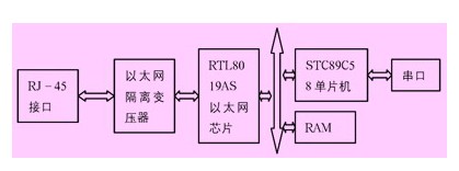 由stc89c58單片機(jī)和rtl8019-as以太網(wǎng)控制器組成硬件平臺(tái),編寫網(wǎng)絡(luò)設(shè)備的驅(qū)動(dòng)程序,實(shí)現(xiàn)以太網(wǎng)通信功能。該系統(tǒng)的硬件結(jié)構(gòu)如圖1所示。該系統(tǒng)模塊可滿足具有rs-232接口的電氣設(shè)備的遠(yuǎn)程監(jiān)控工作需求,是一種具有實(shí)際意義的網(wǎng)絡(luò)通信模塊,該模塊利用網(wǎng)絡(luò)接口芯片rtl8019as使得測控設(shè)備能以低廉的費(fèi)用、簡單的方式接入局域網(wǎng)。以網(wǎng)絡(luò)接口芯片rtl8019as的主要性能符合ethernetⅱ與ieee802.3標(biāo)準(zhǔn),全雙工,收發(fā)可同時(shí)達(dá)到10mb/s的速率。遠(yuǎn)程端pc機(jī)把數(shù)據(jù)發(fā)給以太網(wǎng)接口,以太網(wǎng)接口把數(shù)據(jù)存入ram中,現(xiàn)場串口裝置與單片機(jī)進(jìn)行通訊,從ram中取出數(shù)據(jù)作為現(xiàn)場設(shè)備的控制命令,從而使現(xiàn)場設(shè)備工作狀態(tài)發(fā)生變化。