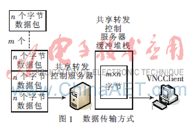 由于VNC服務(wù)器端的機器性能和帶寬等多方面原因,在傳輸過程中會造成性能瓶頸,使得以星形直連方式傳輸數(shù)據(jù)的VNC體系在實際的數(shù)據(jù)會議中應(yīng)用困難。為保證在數(shù)據(jù)會議中數(shù)據(jù)傳輸?shù)膶崟r、穩(wěn)定,可在VNC服務(wù)器和VNC客戶端之間設(shè)置一個共享轉(zhuǎn)發(fā)控制服務(wù)器。