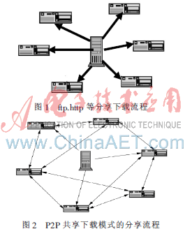 圖1為ftp、http等分享下載流程,P2P共享下載模式的分享流程如圖2所示。