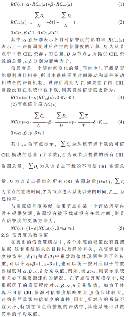 系統(tǒng)中主要涉及資源信譽(yù)度RC(Resource Credit)和節(jié)點(diǎn)信譽(yù)度NC(Node Credit)。資源信譽(yù)度是指節(jié)點(diǎn)提供的CRL列表是否可靠,同時(shí)體現(xiàn)節(jié)點(diǎn)提供CRL分塊的下載量;而節(jié)點(diǎn)信譽(yù)度是指某個(gè)節(jié)點(diǎn)是否能夠及時(shí)、正確無誤地提供CRL分塊的下載,同時(shí)也體現(xiàn)了節(jié)點(diǎn)的在線時(shí)間以及穩(wěn)定性等因子。