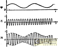 下圖是調(diào)幅裝置的示意圖.接在振蕩器和線圈之間的話筒就是一個(gè)最簡(jiǎn)單的調(diào)制器,由聲源發(fā)出的聲音振動(dòng)使話筒里的碳粒發(fā)生時(shí)松時(shí)緊的變化,它的電阻也發(fā)生時(shí)大時(shí)小的變化。所以,雖然振蕩器產(chǎn)生的是高頻等幅振蕩電流,但是線圈通過的卻是隨聲音而改變的高頻調(diào)幅電流.由于線圈的互感作用,從開放電路中發(fā)射的也是這種高頻調(diào)幅電流。這種電磁波叫調(diào)幅波。
