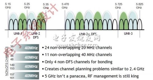 在使用最廣泛的2.4GHz Wi-Fi頻段,總共只有三個(gè)非干擾信道。即使是在5GHz頻段,在去除動(dòng)態(tài)頻率選擇(DFS:一種允許非授權(quán)設(shè)備與現(xiàn)有雷達(dá)系統(tǒng)共享頻譜的機(jī)制)之后也只有4個(gè)非重疊40MHz寬信道(圖1)。