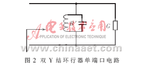 ??? 在分析雙Y結(jié)環(huán)行器時,一般從Y形諧振器出發(fā),把此諧振器看作是由3個stub端口(短截線開路端口)和3個耦合端定義的1個六端口器件。同時運用3個stub端口的邊界條件(終端開路),將此六端口網(wǎng)絡(luò)縮減成了1個三端口網(wǎng)絡(luò)。在理想狀態(tài)下,如果環(huán)行器中表示同相位的模式(n=0、3……)由1個獨立于頻率的短路電路表示,那么此時三端口網(wǎng)絡(luò)則縮減成1個單端口網(wǎng)絡(luò),即用1個單端口電路可以表示1個對稱的雙Y結(jié)環(huán)行器等效電路,此單端口電路如圖2所示。?