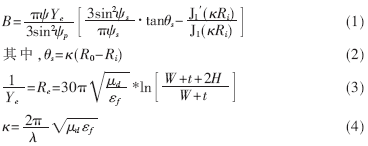 ??? 將W=4.96mm,t=0.127mm,Ze=16.51Ω代入式(3)得:H=2.355,即鐵氧體的厚度為2.355mm,整個環(huán)行器的厚度(帶線厚度)b=2H+t=4.837mm。?