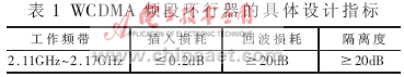 ??? 在WCDMA頻段環(huán)行器的具體設(shè)計指標(biāo)如表1所示。?