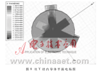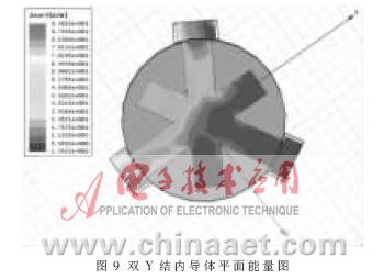 ??? 選定整個雙Y結(jié)內(nèi)導(dǎo)體平面,得到電場圖和能量圖,如圖8、圖9所示。?