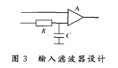 對(duì)于高精度mV 級(jí)的DC放大器 ,其各種交流干擾都將成為放大器寄生信號(hào)的重要信號(hào)源,因此,必須在運(yùn)算放大器的輸入端加輸入濾波器,通常由一個(gè)大電阻(4.7 kΩ)和一個(gè)小電容(3.3μF)構(gòu)成RC濾波,如圖3所示。