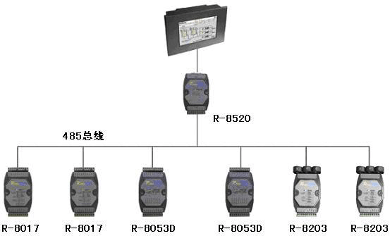 ??? 上位機采用工業(yè)PC機,與下位機采用485進行通信,上位機主要完成工藝流程畫面的顯示,實時采集各點值,并在畫面上動態(tài)顯示實際值,自動保存各點值,自動報警、統(tǒng)計打印、報表等。下位機采用鼎升力創(chuàng)科技的RemoDAQ-8000系列模塊,它由各種AI、AO、DI、DO等組成。其功能,現(xiàn)場信號經(jīng)過線纜,傳輸?shù)礁鞣N模塊中,處理成便于計算機處理的信號,A/D轉(zhuǎn)換后,經(jīng)過485上傳給上位機。