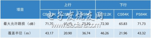 表1為載波功率配置33dBm、終端最大發(fā)射功率為24dBm下的鏈路預(yù)算分析,在單載波功率配置33dBm(2W)的情況下,CS64K業(yè)務(wù)基本滿足上下行鏈路的平衡;在下行載波功率大于33dBm(2W)時(shí),則表現(xiàn)為上行受限。