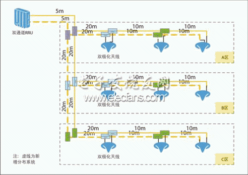 TD-SCDMA雙通道增強(qiáng)覆蓋在原有的室內(nèi)分布天饋系統(tǒng)的基礎(chǔ)上,再增加一套并行一致的天饋系統(tǒng),即TD-SCDMA 雙通道 RRU 需要兩套天饋系統(tǒng)分別接入RRU的2個(gè)通道,如圖1所示。