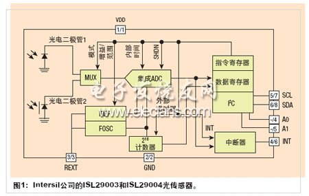 為更好地理解采用一個(gè)光-數(shù)字光傳感器的益處和性能,下面將討論Intersil公司的ISL29003和ISL29004,如圖1所示。