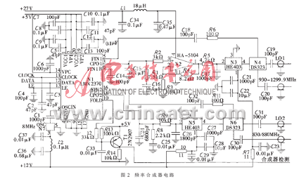 環(huán)路濾波器的設計主要是確定合理的環(huán)路帶寬。本合成器的鎖定時間要求不高(不超過2ms),但需盡量降低噪聲。為此選擇三階無源濾波器(主環(huán)中的C15、C16、R1、R5和C17,副環(huán)中的C24、C25、R8 R9和C26),以增大對鑒相頻率泄漏干擾的抑制。在主環(huán)中,VCO1輸出頻率1300MHz所需的調諧電壓約12V,而環(huán)路濾波器的最大輸出電壓只有5V,為此,在環(huán)路濾波器插入了一級直流放大器(Av=3)。