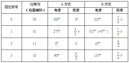 ,則為π/4、3π/4、5π/4、7π/4,此初始相位為π/4的QPSK信號(hào)的矢量圖如下圖1中B方式。QPSK調(diào)制是響應(yīng)進(jìn)入的碼對(duì)(00、01、10、11),對(duì)光載波作相移,表1給出了四元符號(hào)對(duì)應(yīng)的兩個(gè)比特和A、B兩套相位值[2]。