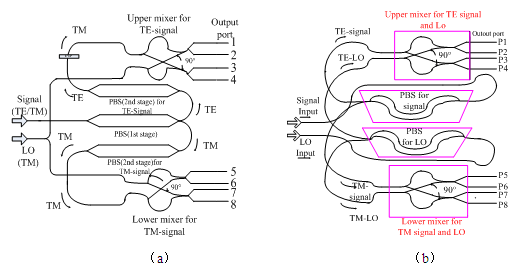 這種用PLC技術(shù)設(shè)計(jì)的單片集成解調(diào)器芯片結(jié)構(gòu)有以下兩種方案,第一種方案如圖4(a)所示,首先輸入信號(hào)通過(guò)一個(gè)基于MZI(馬赫曾德干涉)結(jié)構(gòu)的PBS,將輸入信號(hào)分為T(mén)E和TM兩個(gè)偏振態(tài)(此為第一級(jí)偏振分束),并沿上下兩個(gè)支路傳播,這兩路偏振信號(hào)再分別經(jīng)過(guò)2個(gè)PBS結(jié)構(gòu),使得TE模和TM模進(jìn)一步分開(kāi)(此為第二級(jí)偏振分束),通過(guò)這兩級(jí)偏振分束可以大幅度改善偏振消光比。上支路傳播的TE模信號(hào)光,經(jīng)過(guò)一個(gè)與主軸成45°的半波片,轉(zhuǎn)化為T(mén)M模信號(hào),另一方面,我們將從本地振蕩源輸入的光控制為T(mén)M模式,這個(gè)輸入的光信號(hào)經(jīng)過(guò)一個(gè)3dB耦合器,分為上下兩路光信號(hào),并與上支路轉(zhuǎn)化的TM模信號(hào)光和下支路的TM模信號(hào)光一起分別導(dǎo)入上下兩個(gè)90°混頻器,并解調(diào)輸出8路光信號(hào)。在OFC2010上,Furukawa公司按這種方案設(shè)計(jì)制作出的芯片尺寸可以達(dá)到25×21mm,最小偏振消光比33.2dB[4]。