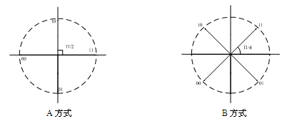 ,則為0、π/2、π、3π/2,此初始相位為0的QPSK信號(hào)的矢量圖如下圖1中A方式;若